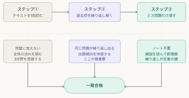 合格への最短ルートはシンプルだ。テキストで大まかな流れをつかんだあとは、過去問を繰り返す——この2ステップに集中することが最も効率的だ。