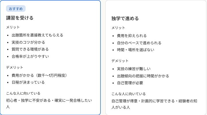 費用の差はせいぜい数千円。一度落ちて再受験するコスト(時間・手数料)を考えれば、講習を選ぶ方が合理的だ。