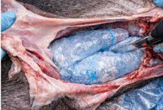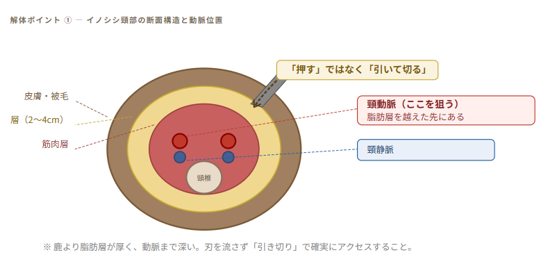 イノシシ頸部断面。脂肪層が厚く、頸動脈へのアクセスに工夫が必要。