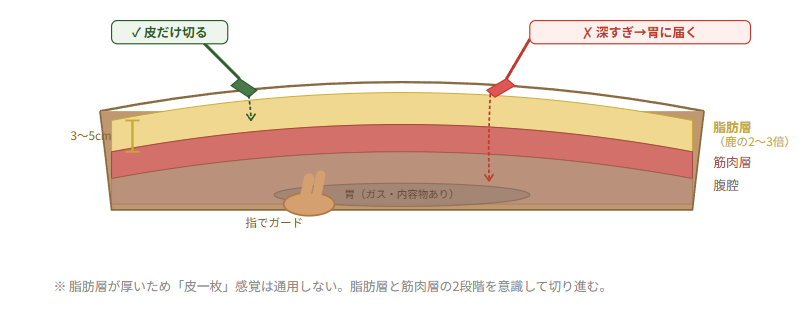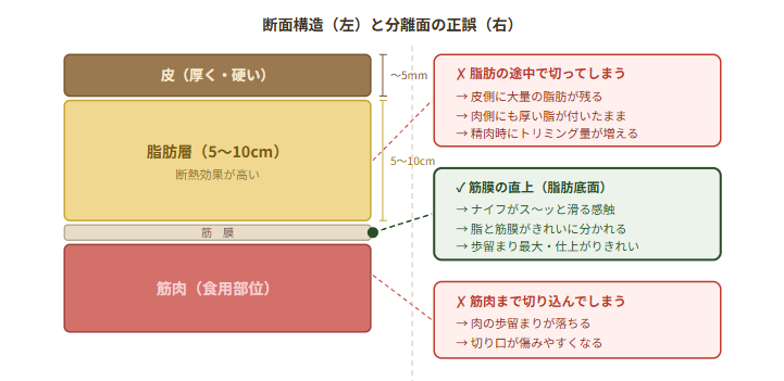 皮剥ぎの層構造と正しい分離面。「筋膜直上」を狙うとナイフがスムーズに滑る。