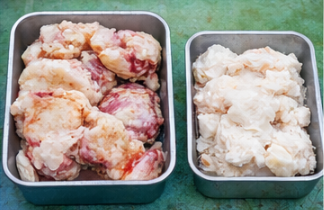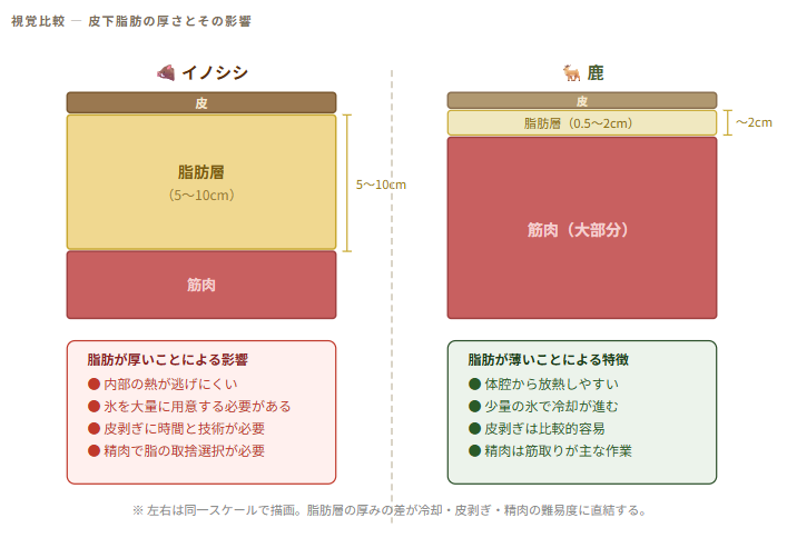 イノシシ(左)と鹿(右)の断面を同一スケールで比較。脂肪層の差が全工程の難易度を左右する。