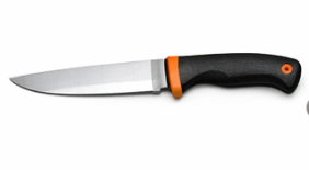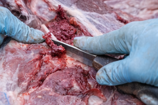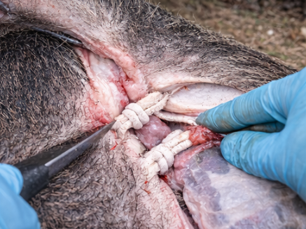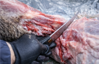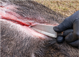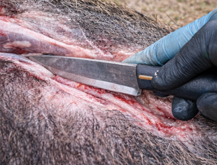 イノシシ腹部断面。脂肪層が鹿の2〜3倍。焦らず指ガードで切り進む。