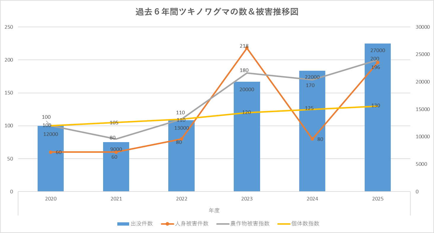 過去6年間ツキノワグマの数&被害推移図 ※指数は「2020=100」