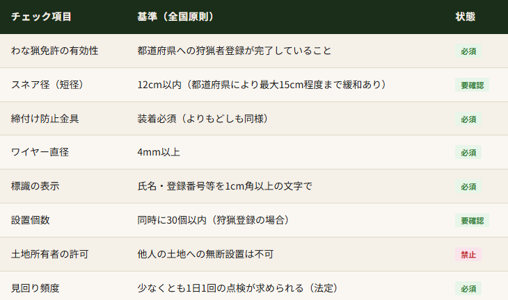 ① スネア(輪)の直径が12cmを超えるものは原則禁止(短径で計測)。ただし都道府県の特定鳥獣管理計画により一部緩和されており、例えば岡山県では15cm以下まで許可されています。