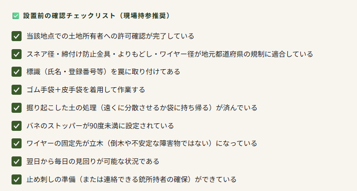 場所の話に入る前に、まず押さえておかなければならない法律上のルールを整理します。これを知らずに設置してしまうと、捕獲の成否以前に犯罪行為になりかねません。