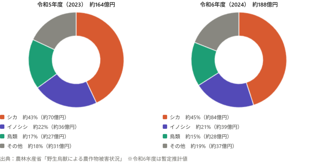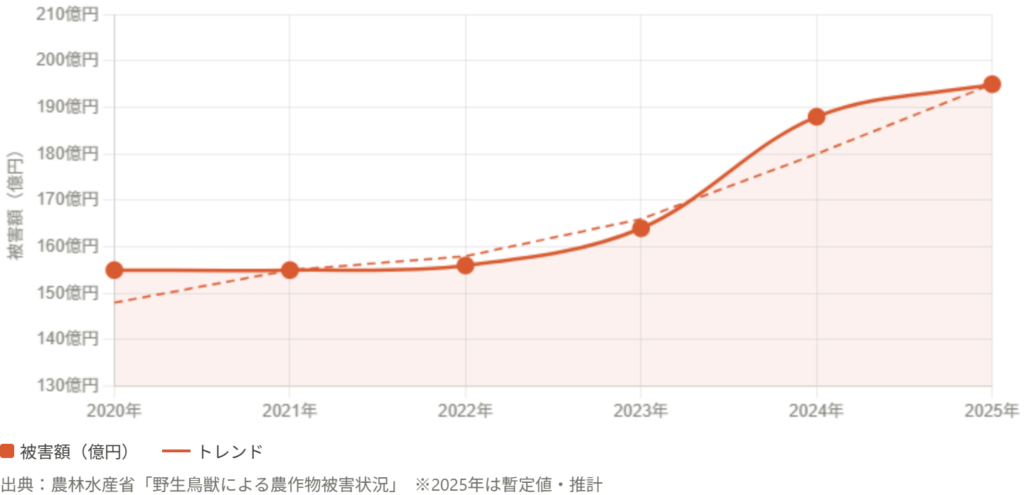 鳥獣被害は減少から再び増加へ。2024年度は約188億円と近年最大水準に達した。
