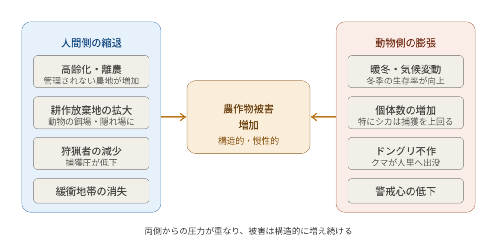 ぜ被害は増え続けるのか?人間側の縮退と動物側の膨張が同時に進行している。